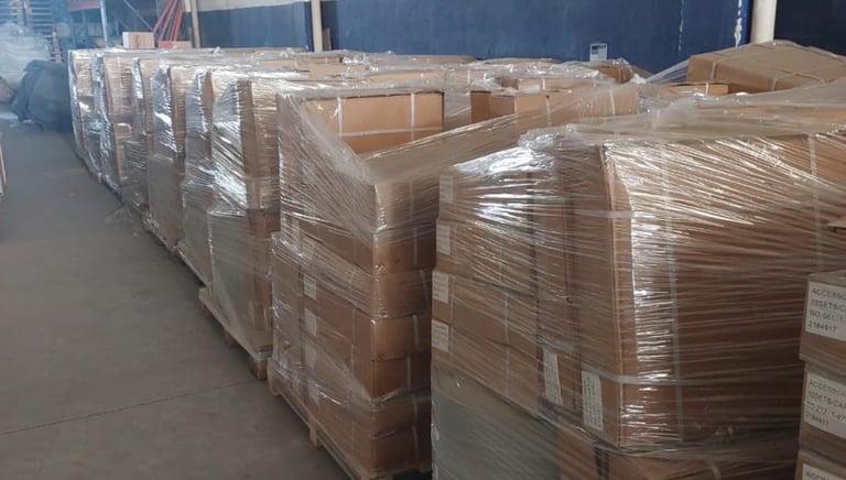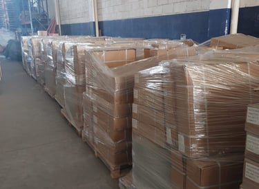 Organização dos produtos em paletes e aplicação de filme plástico para proteção e melhor transporte.